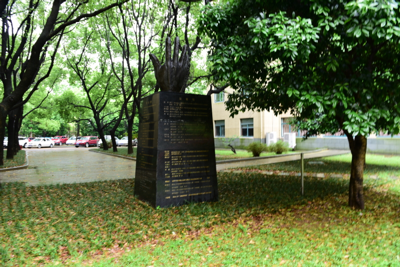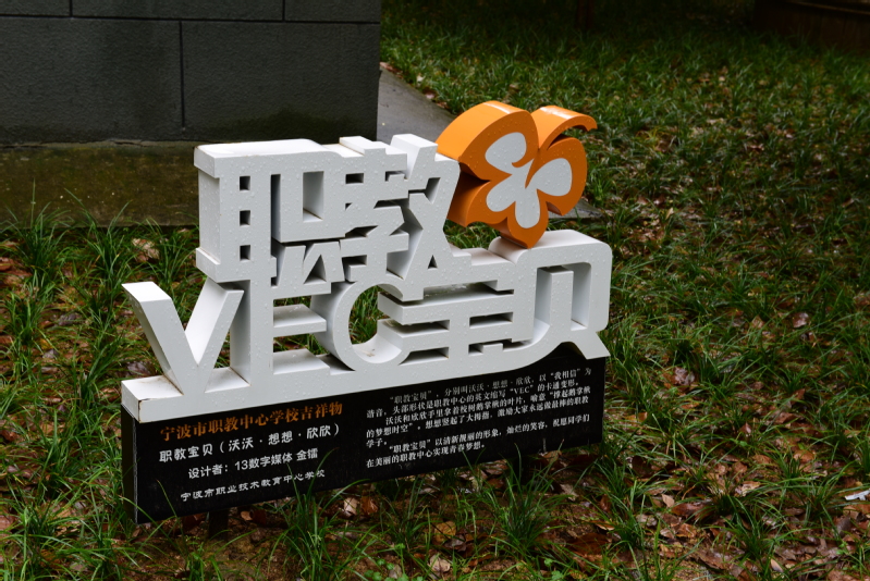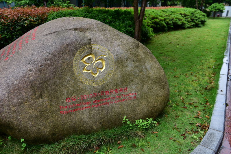 穿过走道,草地上一方滚圆的石头吸引了我们的注意,上面镌刻着一枚金色鹅掌楸叶,这种树是国家二级保护稀有植物,树形高大,笔直的树干,宽阔的树冠,其叶子如给人温暖和信赖的大手掌。色彩明快的蝶形鹅掌楸叶是校标主造型,寄言职教中心人坚守足下的土地,弘扬“大爱”,正言直行,象征在“激发潜能,成就卓越”的校园精神感召下,丰富的专业课程和隽永的校园文化将引领职教中心学子“破茧成蝶”,翩跹舞动人生路,成为“受社会尊重的人”。