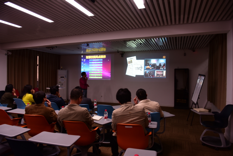 在会议室,周立山为我们演示了神奇的智慧校园。他给我们讲了桌面云的应用、智慧校园卡、多媒体远程控制、太阳能热水器智能控制RFID资产管理、移动图书馆、智慧校园管理平台,资源与网络数字管理平台等7大信息系统的运用。如:校园一卡通系统具有电子钱包、图书借阅、智能门禁、云打印身份认证等功能,还能在学生走班上课时考勤,教师轻松实现了新课改背景下的学生走班管理。车载蓝牙识别系统,教师车辆出入学校时,校门会自动开启。邮包提醒系统将教职工的各类邮件和包裹信息及时通知到手机,等等,给我们留下了深刻的印象。
