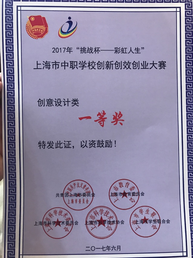 在“大众创业、万众创新”的时代背景下,由团市委、市教委、市科委、市科协、市学联共同举办的2017年“挑战杯——彩虹人生”上海市职业学校学生创新创效创业大赛于6月3日在上海信息技术学校进行决赛,最终由我校邱子扬同学制作,朱红权老师指导的“家庭擦鞋器”荣获了本次比赛创意类作品一等奖。
