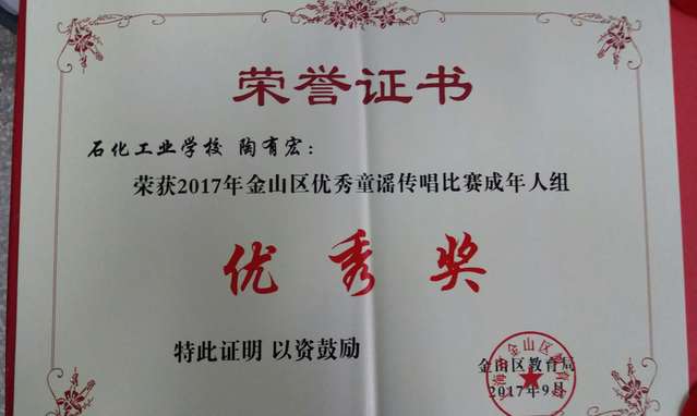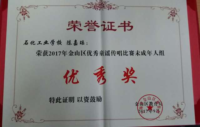 近期,由金山区文明办、金山区教育局、共青团金山区委联合组织的“2017年金山区优秀童谣征集推广活动”,历时三月,圆满结束。我校陶有宏老师荣获“2017年金山区优秀童谣传唱比赛成年人组”优秀奖,160运用化工班陈嘉瑶荣获“2017年金山区优秀童谣传唱比赛未成年人组”优秀奖。