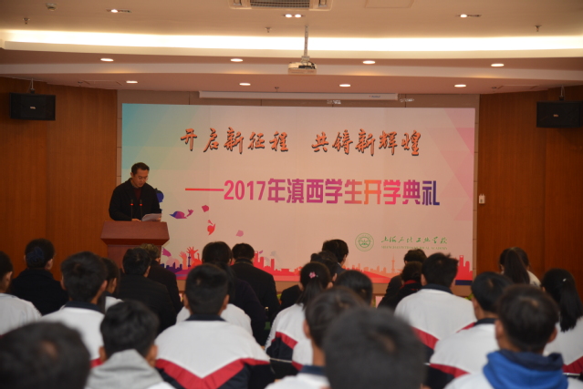 2017年12月7日上午,我校在南区新大楼二楼会议室举行滇西学生开学典礼。校长高炬、党委书记林国新、副校长黄汉军、工会主席孙曙光、学生处主任杜海燕、教务主任沈晨阳、机电科科长王根发、经贸科科长贾佩新、经贸科副科长江军花及班主任阮祎、郭军强出席了本次开学典礼,典礼由团委书记唐辰炜主持。