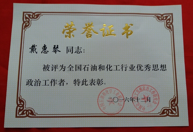 近日,在山东青岛举行的中国化工职工思想政治工作研究会第七次会员大会上我校被评为被中国石油和化学工业联合会、中国化工职工思想政治工作研究会授予“党建及思想政治工作先进单位”荣誉称号;我校戴惠琴老师被授予“优秀思想政治工作者”荣誉称号,在会上获表彰。
