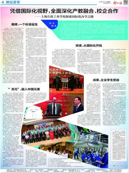 1月31日,在建校四十周年之际,我校AHK中德化工培训基地揭牌仪式也刚刚过去三天,解放日报在教坛荟萃专栏适时发表了《凭借国际化视野,全面产教融合、校企合作——上海石化工业学校探索国际化办学之路》》评论性文章。为此,解放日报吴俊英、余晓俊两位记者早在一个月前就来到学校,与学校领导、相关科室负责人及学生开展深入访谈,了解过程与细节,文章比较全面地回顾了学校多年来,不断深化产教融合、校企合作,扎实推动学校国际化办学的历程,最终取得了比较显著的社会成效。