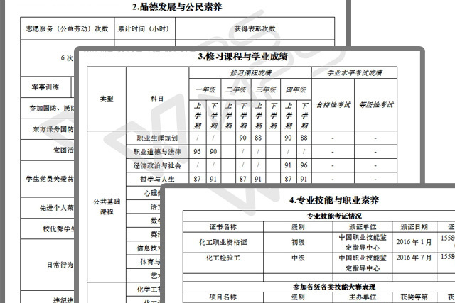 上海市中等职业学校学生综合素质评价体系从“基本信息和自我介绍、品德发展与公民素养、修习课程与学业成绩、专业技能与职业素养、身心健康与艺术修养、学生学业与发展水平评价承诺”多个方面整体反映学生德智体美全面发展及个性特长的情况。以事实为依据,对学生成长过程中的主要经历和典型事例作客观记录和写实性描述,涵盖文化素质和职业技能,真实反映学生全面发展情况和个性特长,对学生学习和生涯规划起到指导作用,促进学生个性化发展与多样成才。