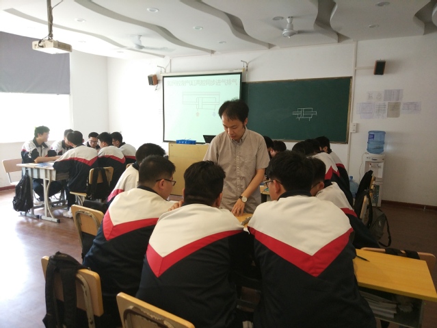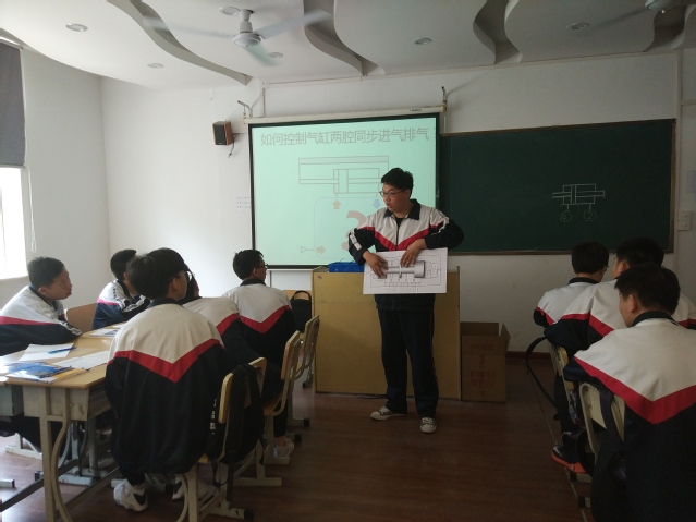此次公开课的课题是《气动工作台的手动控制》。这是一堂理论实践紧密结合的课程,包含着这门课程中的一个重点内容——换向阀,这一直是学生知识掌握的薄弱环节。王凡老师精心设计教学环节,创造条件,为学生动手操作提供了条件和可能。以工作任务为引领,围绕工作任务展开课程的实施。针对换向阀工作原理这个课程难点,王凡老师将课堂的主动权还给学生。为学生提供详尽的换向阀工作原理相关资料,由学生阅读、讨论,自行探索其内部的真谛。并使用硬纸板做成的教具,学生根据自身的理解,独立讲解换向阀的工作原理。