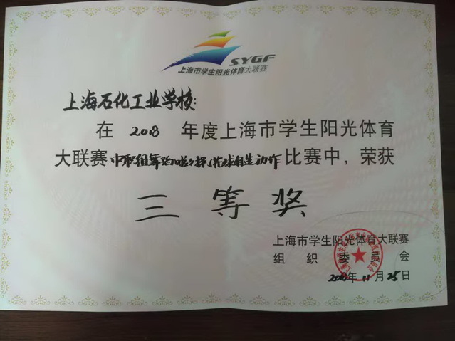 11月25日,我校啦啦队一行24人来到上海医药学校参加上海市学生阳光体育大联赛(中职组)啦啦操比赛,获得规定示范套路和自编花球的三等奖。