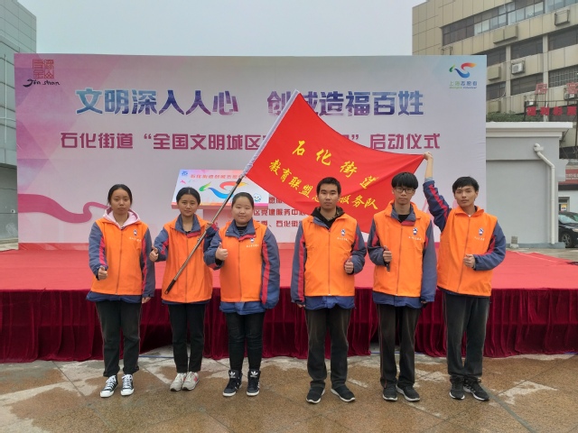 石化街道党工委书记李泱泱为本次活动致辞,创建全国文明城区是区委、区政府做出的一项重要战略部署,是全区人民提高生活质量和文明程度的共同愿望,要让志愿服务的过程成为全面助推社区治理创新、助推金山创城、融入长三角一体化发展的全过程,让“奉献、友爱、互助、进步”的志愿服务精神具有更多内涵和更高境界,为落实“两区一堡”战略定位,加快打造“三区”“五地”、全面建设“三个金山”而努力奋斗。随后石化街道党工委副书记李洁、沈臻峰为我校创城志愿服务团队代表顾奕雯同学授旗。