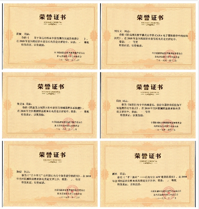 其中机电科徐卫东老师的《职业能力视野下的中职学习领域课程体系构建》、刘文文老师的《游戏闯关教学模式在中职CAXA电子图版教学中的应用探究》、周红老师的《深化机电专业内涵建设,创建全国职业院校加工制造类示范专业点》、陈姗老师的《基于罩壳内轴承卡簧检测的识别系统设计》荣获一等奖;陈姗老师的《“自主学习”在中职机电专业课堂教学的探究》荣获二等奖;臧欢老师的《“掌上机电”——机电专业APP建设的探索》荣获三等奖。