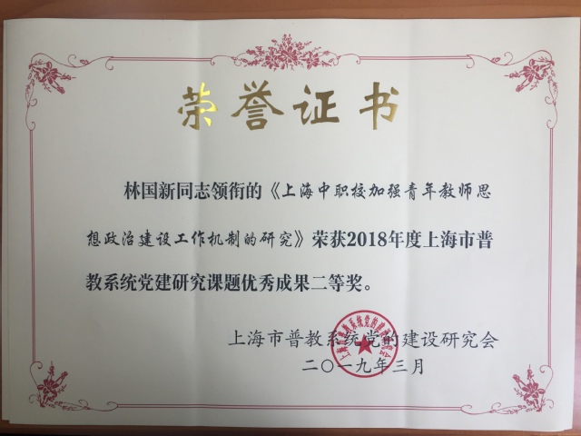 市普教系统党的建设研究会近日遴选出2018年度党建研究课题优秀成果,我校党委书记林国新领衔的《上海中职校加强青年教师思想政治建设工作机制的研究》荣获二等奖。