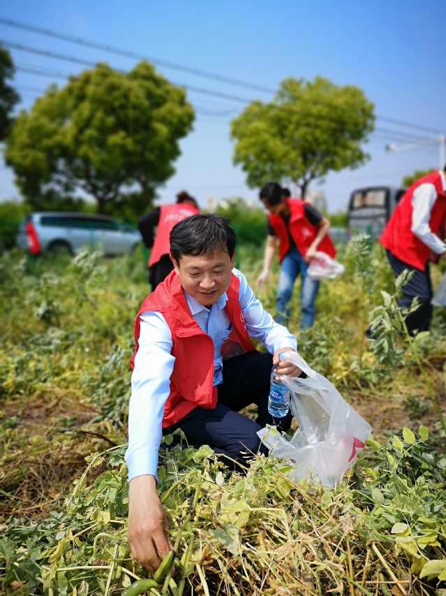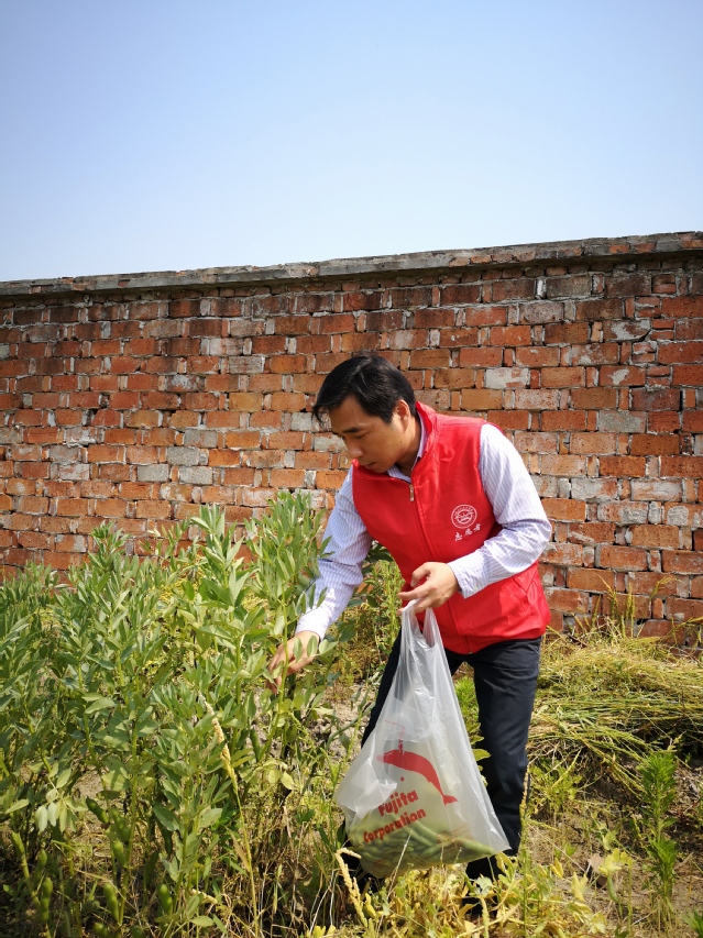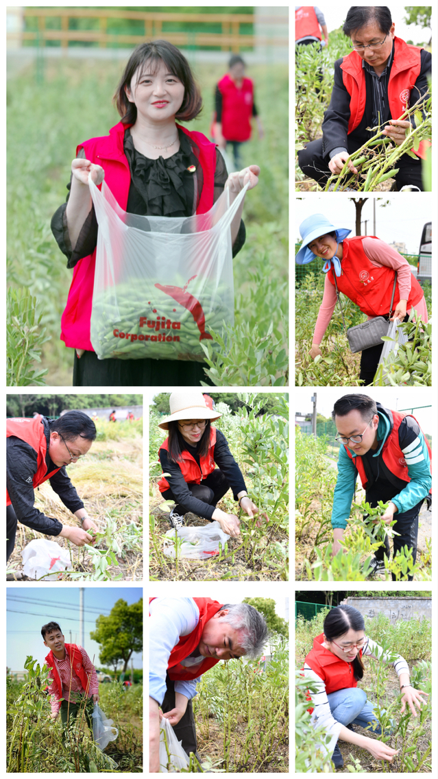 活动前期,校党委书记林国新带领近40名党员志愿者来到塔港村采摘成熟的蚕豆。在塔港村主任唐燕萍的引导下,一行人来到蚕豆地摸索、学习、交流着采摘蚕豆的诀窍与技巧。经过一个多小时的采摘,大家将摘得的70余袋蚕豆运回学校,开始第二环节的爱心义卖活动。