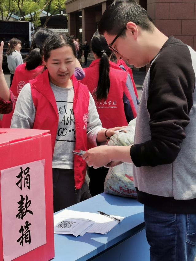 爱心义卖活动中,校领导、科室领导率先垂范,教职工积极响应,不少学生也参与其中。“金钱有价,爱心无价。志愿者们辛苦啦,我来2袋”,“这个活动很有意义,我要3袋”,“我是171巴斯夫班的学生,我买1袋”……短时间内,爱心蚕豆被抢购一空,爱心义卖活动圆满结束。