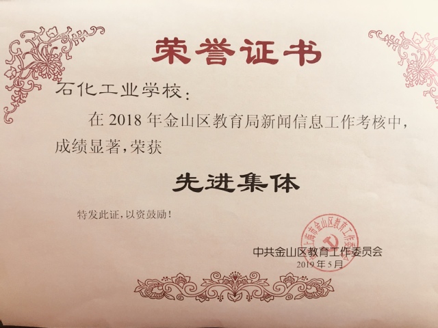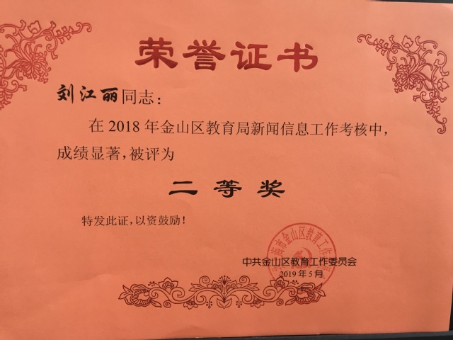 5月9日下午,2019年金山区教育系统宣传思想工作暨创建全国文明城区推送大会在区教育局大会议室隆重举行。金山区教育工作党委书记顾宏伟、局长郑瑛、副局长吴颖出席会议。我校党委书记林国新和宣传信息员参加了本次会议。在年度表彰中,我校荣获“2018金山区教育局新闻信息工作先进集体”称号;在2018年度金山区教育局新闻信息工作考核中,宣传信息员刘江丽荣获二等奖。