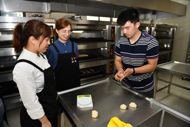 在美妙的乐声中品一杯茗茶,在电脑上制作一把三维造型的椅子……不同的体验项目吸引了不同的体验者前来。来自松隐中学初三年级的张同学是一位西点制作的爱好者,他和妈妈一同前来体验,选择的第一个项目就是西点烘焙。称重、揉面、造型,一切都是手到擒来。张同学娴熟的操作引来其他体验者的啧啧称赞,而张同学的妈妈表示:“他特别喜欢西点制作,在家里也经常自己动手做。这次有机会来体验职业,他还是首选体验西点制作。”