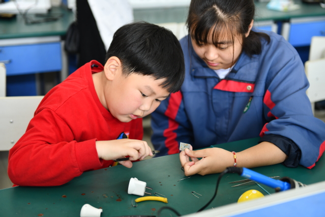 不管是中学生还是小学生,都在体验课堂中尽情遨游,探索职业奥秘,感悟工匠精神。
