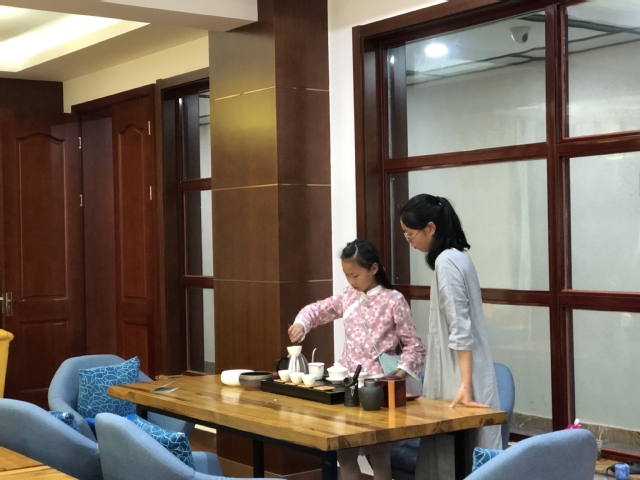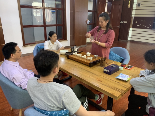 一走进经贸实训楼的茶歇室,就能看到古色古香的茶具整齐摆放在桌面上,项目负责教师唐之韵和社团学生为体验者安排了茶艺展示,运用选茶、辩水、选具、涤器、投茶等方法、技巧,沏泡出一壶好茶汤,也让体验者担任茶艺师体验了一番。