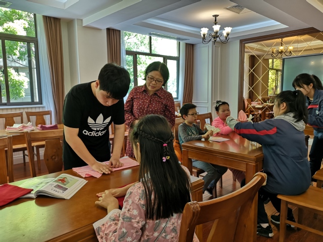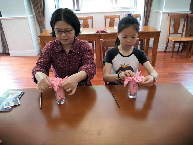二楼的餐巾折花作为经贸科职业体验保留项目,也得到了不少女孩子的垂青。项目负责教师朱金花手把手教体验者们折出了各种式样的花型,非常赏心悦目。