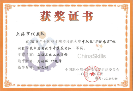 5月21日-5月22日,2019年全国职业院校技能大赛(中职组)“机器人技术应用”赛项在无锡机电高等职业技术学校举行,来自全国各地的代表队118支,236名参赛选手同台竞技参加比赛。我校选手周晓辉、叶光泽通过第八届“星光计划”上海市职业院校技能大赛的选拔,成为机器人技术应用上海市代表队的参赛选手,他们以精湛的技艺、严谨的态度全身心投入到比赛中,展现了良好的职业素养和默契的团队协作,在2019年全国职业院校技能大赛中职组“华航唯实”杯机器人技术应用比赛中荣获团队二等奖。