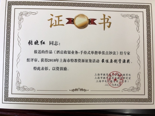 2019年5月16日,上海市特教中心组织开展2018年特教资源征集活动总结会,我校张晓红老师获上海市“最佳原创资源奖”,并前往上海开放大学国际会议中心参加此次会议。
