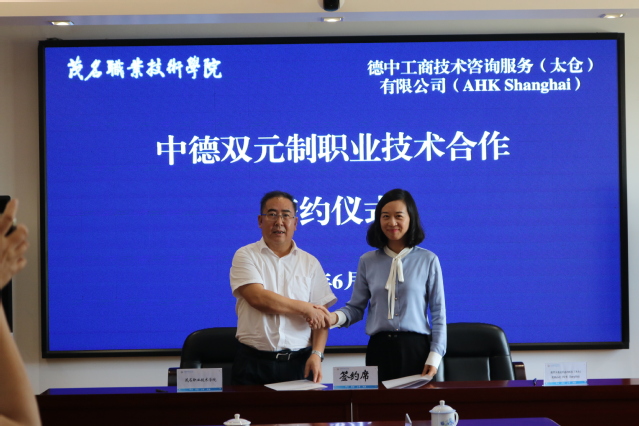 2019年6月6日,我校AHK中德化工职业培训基地与广东茂名职业技术学院签订了“AHK中德化工职业培训基地支持茂名职业技术学院建设AHK中德(茂名)化工职业培训中心合作协议书”。此举标志着AHK中德化工职业培训基地的示范作用已辐射至华南地区, 基地将积极助推华南地区化工类院校双元人才培养本土化的落地和实施, 助力华南职业教育国际化水平的提升。德国AHK职业教育副总监陈丽玮、上海石化工业学校校长高炬、茂名职业技术学院院长张庆以及双方学校专业科及校办的老师出席了签约仪式。签约仪式由茂名职业技术学院副院长梁德萍主持。