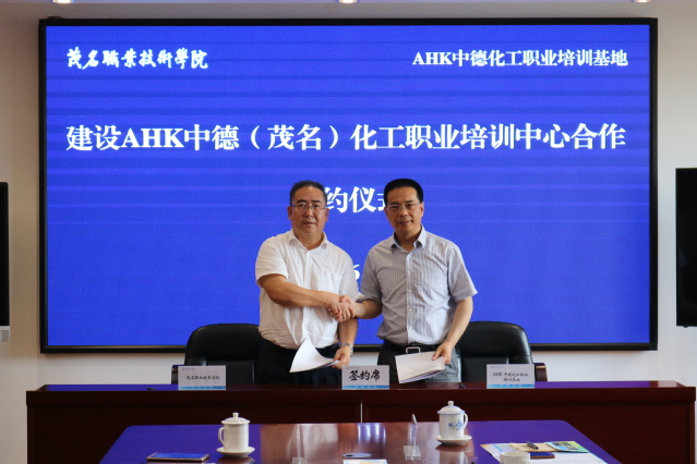 签约仪式上,高炬校长代表AHK中德化工职业培训基地致辞。自2018年1月26日“AHK中德化工职业培训基地”落户上海石化工业学校后,在AHK中德化工专业建设指导委员会和AHK(中国)化工考试委员会的指导下,以学校、化工跨企业培训中心和合作的世界知名化工企业为引擎, 构建了“学校、跨企业培训中心、企业”三站联动的培养模式, 实现了AHK化工操作员的本土化标准, 为企业提供了高质量的技能技术型人才。同时, 基地积极发挥引领示范和辐射的作用, 助推全国职业院校化工类专业在课程开发、资源拓展、师资培训等相关工作,实现人才双元培养模式本土化的落地与实施。学校将助力茂名职业技术学院更有效深入地开展校企合作,建设校内实训实习基地,建立跨企业培训基地,对接国际标准并引进国际资格证书,形成具有国际化理念和标准的校企合作人才培养新模式。