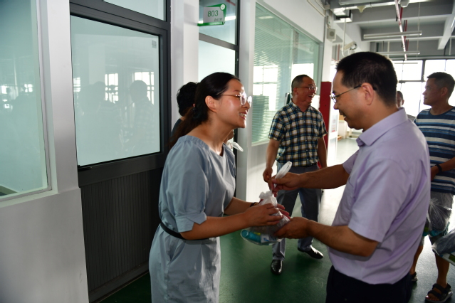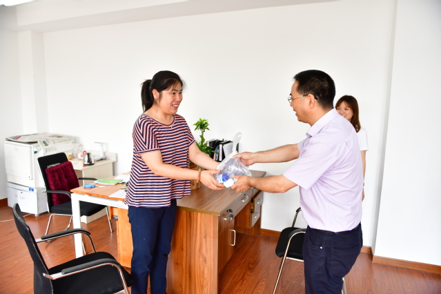 8月15日上午,学校校长高炬、工会主席迮育彪在校长办公室负责人的陪同下,先后来到总务处、学生处、机电科、化工科、教务处、财务处等有关部门,向暑期坚守工作岗位的一线教职工表示慰问,并送上防暑降温慰问品。