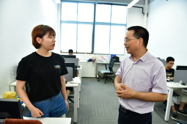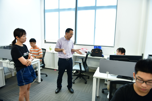 校领导一行首先来到南区综合楼。在这里,学校总务处、信息中心、纪检办等正与相关服务商认真洽谈学校校园改扩建工程与暑期校园升级及维护事务。校领导们对教职工在酷暑中坚守岗位的精神表示赞许,嘱咐大家在按期完成工程进度的同时,一定要注意防暑降温,保证文明施工、安全施工。在学生处,校领导赞扬大家暑期坚守岗位的同时,叮嘱要做好新生军训等准备工作。学校机电科正汇集多方力量,深入研讨机电智能制造实训中心大楼的优化设计工作,校领导鼓励机电科要把握设计高度、紧贴应用实际,高质量建设好学校的该项重点建设工程。
