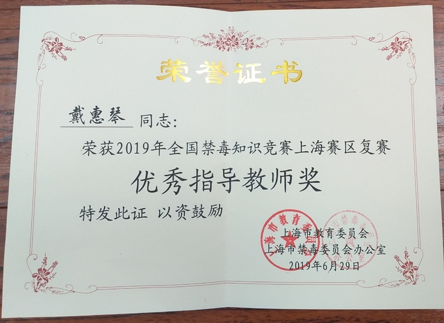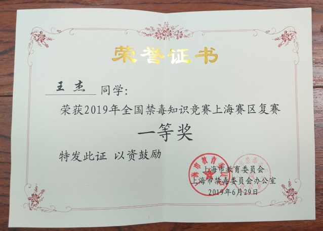 近日,捷报传来,我校170应用化工班王杰与蒙山中学张喆、华师大三附中蔡雨柔、金山小学施茗浩等四位同学荣获2019年全国禁毒知识竞赛上海赛区复赛(团体)一等奖!我校学生处戴惠琴老师荣获2019年全国禁毒知识竞赛上海赛区复赛优秀指导教师。
