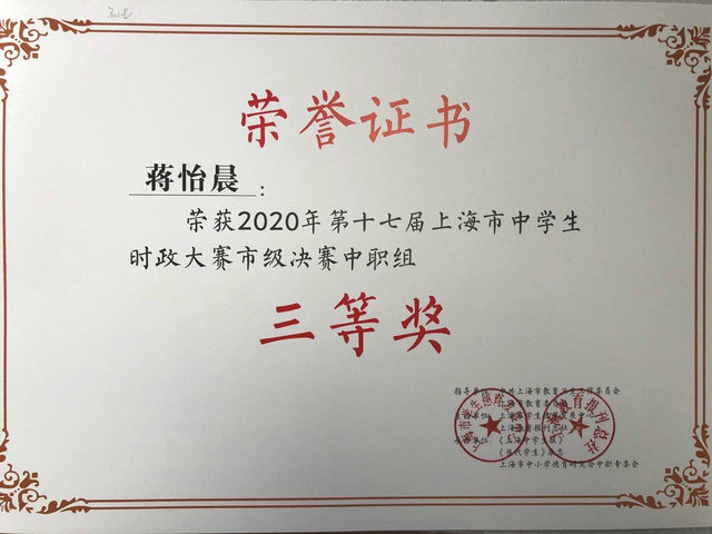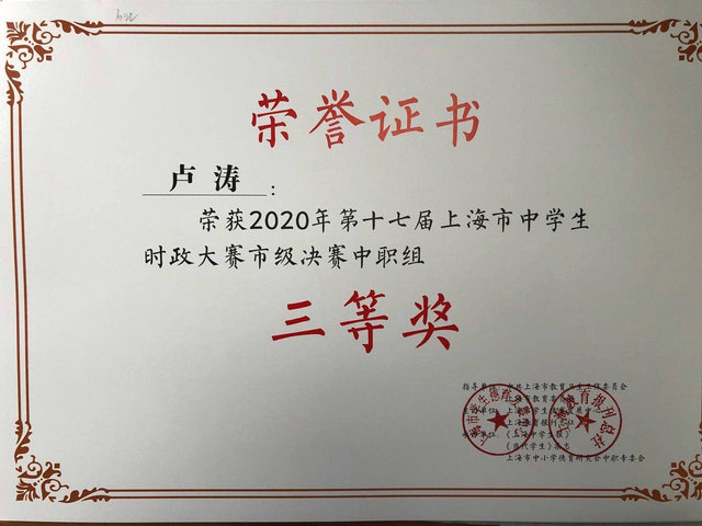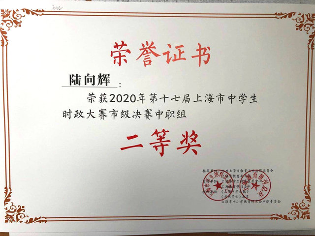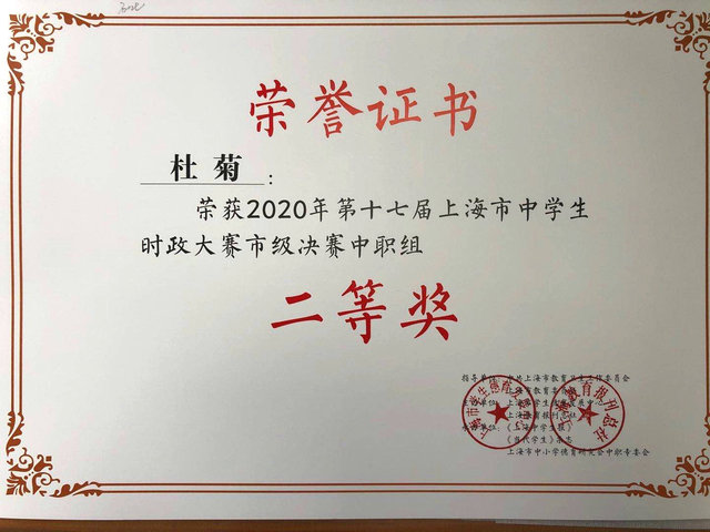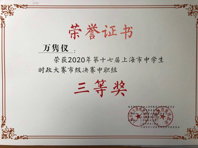 近日组委会颁布第十七届上海市中学生时政大赛决赛获奖名单,我校七名学生喜获佳绩。杜菊、陆向辉获二等奖,卢涛、蒋怡晨、万隽仪获三等奖,王瑞银、沈涵获优胜奖。