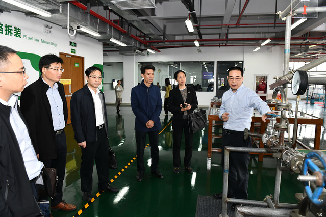 在高炬的陪同下,来宾们参观了学校校史馆、化工与人类科普展示馆、跨企业培训中心,了解学校办学历程和实训室运行、管理等方面情况。来到化工综合实训大楼,来宾们参观了AHK中德化工职业培训基地,了解基地运行情况,在特种作业考试培训现场,教师们为来宾演示了各装置模拟考试流程。