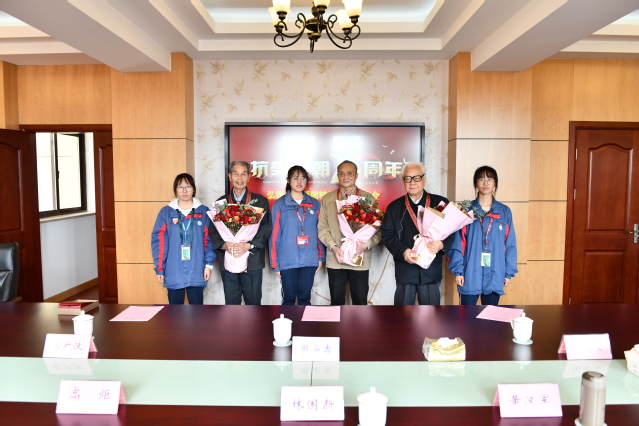 会上,校党委书记林国新,党委副书记、校长高炬及副校长黄汉军为三位老战士佩戴了由中共中央、国务院、中央军委联合颁发的“中国人民志愿军抗美援朝出国作战70周年纪念章”。学生代表向三位老战士献花。