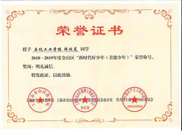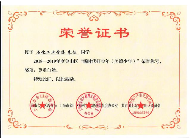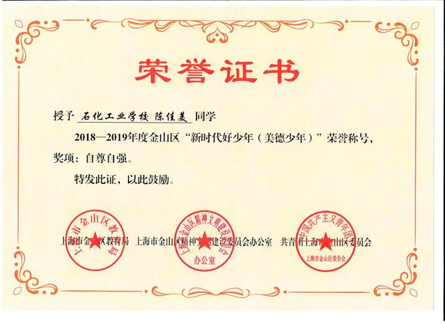 近日金山区中小学生(中职生)“新时代好少年(美德少年)”评选结果出炉,我校共有4位学生获奖,陈佳美获得“自尊自强”奖,王瑞银获得“勤学善思”奖项,顾欣岚获得“明礼诚信”奖,朱征获得“尊重自然”奖。我们一起学习这些美德少年吧!