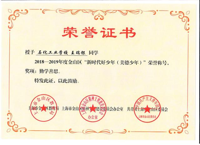王瑞银是优秀云南学生代表,来校后快速适应生活和学习环境,特别勤奋好学,有不懂的内容一定会找老师请教,经过努力她的成绩名列专业科前茅。她勇于挑战自我,要求全面发展,为了克服不爱讲话的缺点,她积极要求参加演讲比赛,每时每刻都在拿着稿子,一遍一遍的模拟演讲,先后获得了演讲比赛校一等奖、金山区三等奖的好成绩。她是一名优秀的团员,在思想上要求进步,关心时事政治,刻苦备赛参加上海市中学生时政大赛获得市二等奖。