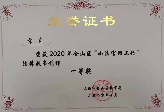 根据《关于开展2020年“春天的蒲公英--小法官网上行”活动的通知》精神,我校开展了“小法官网上行”活动,经学生处选送、教育局专家评审,章芹老师创作的《雇佣黑客盗窃同学游戏账号内的虚拟装备》征文荣获金区“小法官网上行”法律故事创作一等奖。