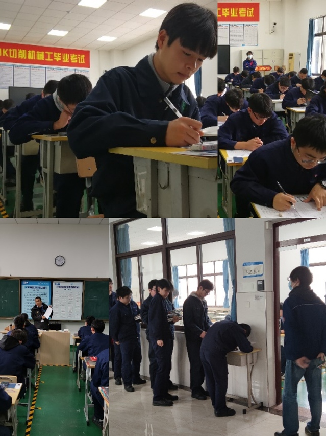 12月9日至11日,实践考试分三批进行。实践考试分为“计划”、“实施”、“检查”三个工作任务。考生需要在6.5个小时内,根据给定的两个零件图纸,编制加工工艺,分别在车床和铣床上完成零件加工,最后进行尺寸测量完成零件检查,在此过程中,考官会在考生实施工作任务的间隙,进行情景专业会话。考前,冯老师对实践考试的注意事项进行了说明,强调了安全的重要性。考生们认真严谨,沉着冷静,抖擞精神,全力以赴。