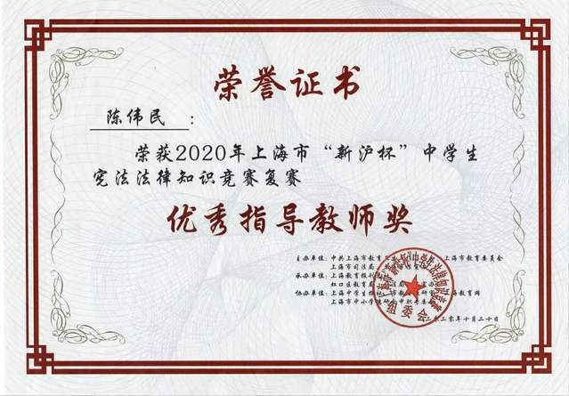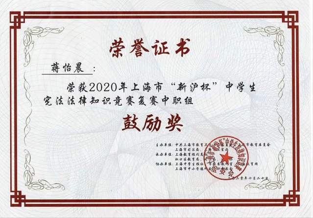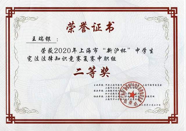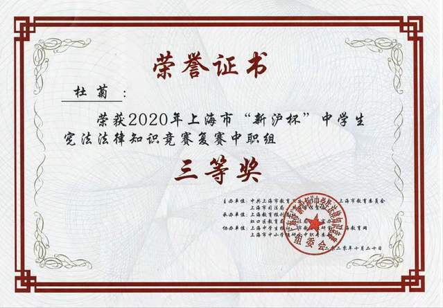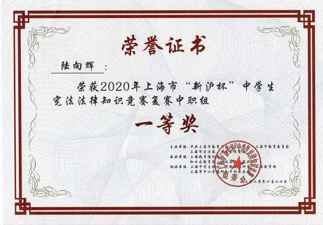 近日喜讯传来,我校学生在“新沪杯”法律大赛中获得市级一、二、三等奖好成绩。为贯彻落实国家和上海市“七五”普法规划,推进“法律进学校”活动,上海市教卫党委、市教委、市司法局、市法宣办举办了2020年上海市“新沪杯”中学生法律知识竞赛活动,今年竞赛的主题是“学法用法 崇德尚法”。此次竞赛旨在弘扬宪法精神,提高青少年法律素质,丰富他们的法律知识。比赛内容包括宪法、民法典、刑法、未成年人保护法等有关青少年保护方面的法律法规。