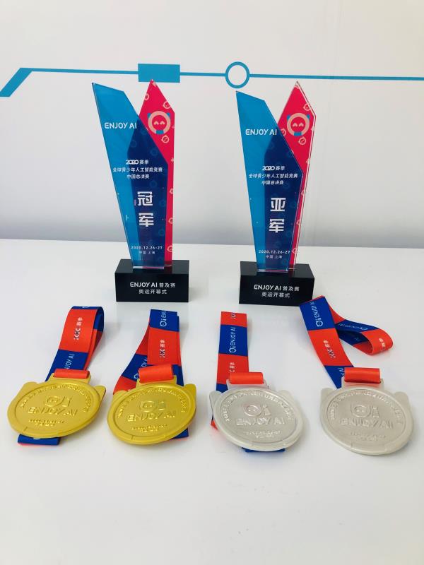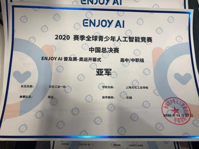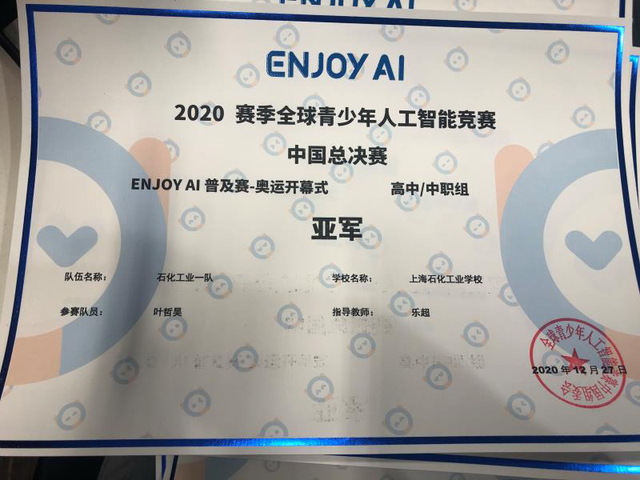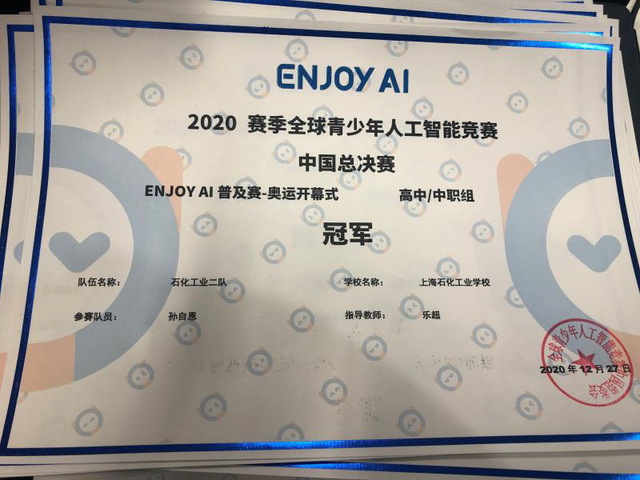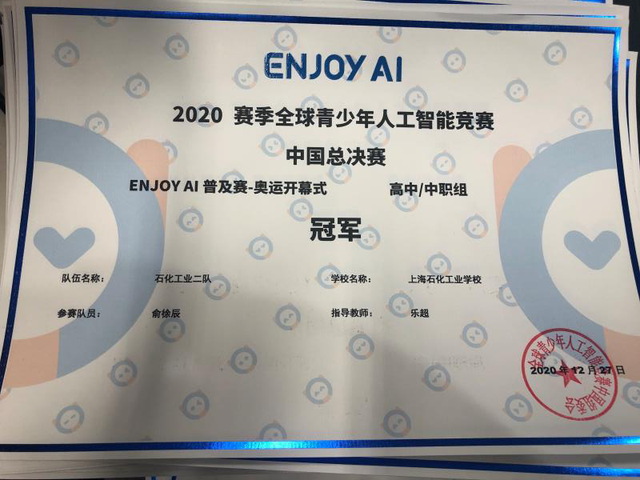 ENJOY AI2020赛季全球青少年人工智能竞赛中国总决赛于12月27日在上海国家会展中心举行,来自全国22个省的近4000名青少年齐聚申城,上演了一场紧张、激烈的高手对决。本次大赛由中国电子学会、上海市经济与信息化委员会、上海市闵行区人民政府指导,全球青少年人工智能联合会、百度智能云、百度云智学院主办,全球青少年人工智能竞赛中国组委会承办。我校181计算机班叶哲昊、高远、孙自恩和俞徐辰四人代表学校参赛。四位参赛选手从全国36支参赛队中脱颖而出,包揽了“奥运开幕式”项目高中组冠亚军。
