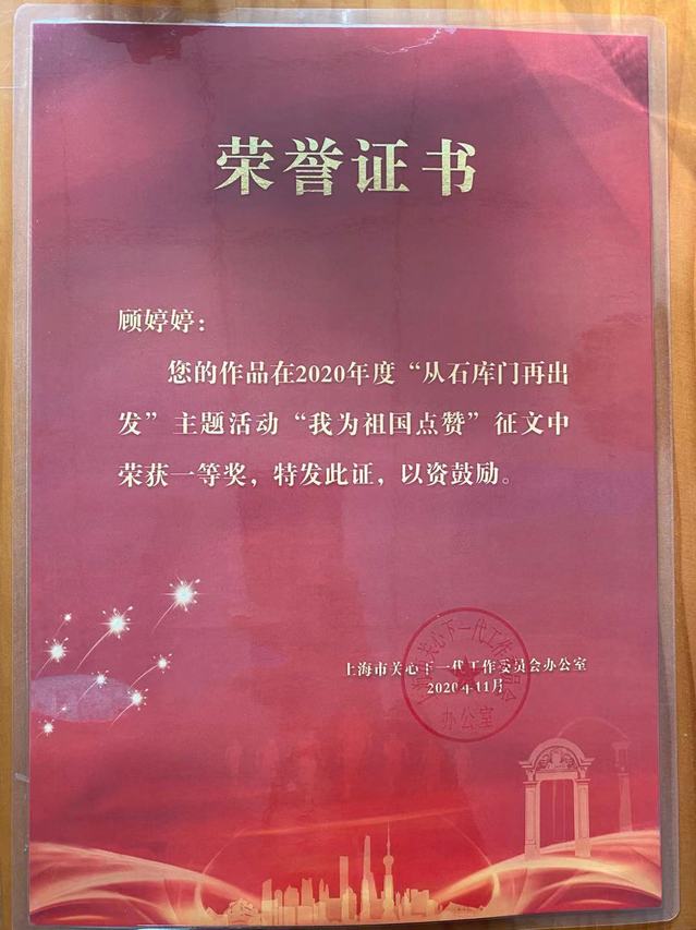 我校加强多部门联手联动,积极整合相关教育资源,融入相关活动平台,为组织展开主题教育活动创造条件。在活动过程中,结合“众志成城战疫情”“万众一心决胜全面小康”形势任务,组织学生在老师指导下积极撰写爱党爱国爱社会主义的文章。在老师的悉心指导下,我校顾婷婷同学荣获2020年度“从石库门再出发”主题活动“为祖国点赞”征文一等奖。