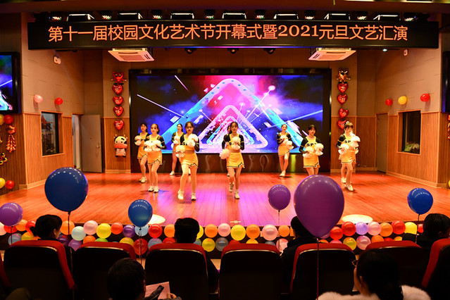 在动感、热情的开场舞啦啦操之后,全体校领导上台为全校师生送出新年祝福,校长高炬上台致新年贺词,2020年是不平凡的一年,全校教师和同学们面对突如其来的疫情,克服重重困难,顺利完成学校的工作和学习。在新形势下,高炬号召全校师生一起奋斗,积极推动学校建设,在新年的钟声敲响之际,一同迎接2021年的到来,祝福学校再创辉煌、祝福教师工作顺利、祝福学生学业有成。在热烈的掌声和激动的欢呼声中,主持人宣布第十一届校园文化艺术节暨2021年元旦文艺汇演正式开始。