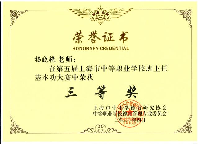 第五届上海市中职班主任基本功大赛结果近日揭晓,我校三位参赛教师全部获奖,徐颖获二等奖,杨晓艳、汤豪杰两位教师获三等奖。