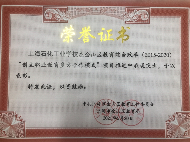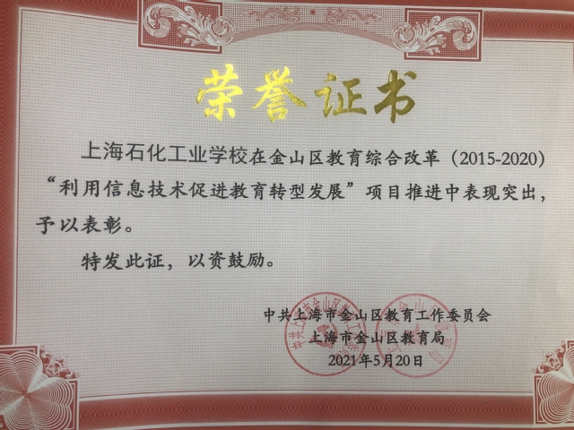 近日,金山区教育综合改革总结暨表彰大会召开,会上共表彰各项目先进集体131个,先进个人120名。我校在“创立职业教育多方合作模式”“利用信息技术促进教育转型发展”2个项目中表现突出,获得“先进集体”表彰。我校黄汉军、胡迪君、陈姗和殷洁4位教师获得“创立职业教育多方合作模式”“先进个人”荣誉。