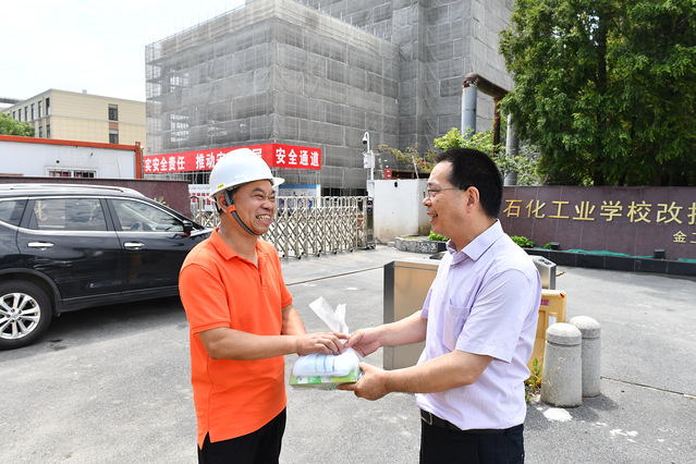 在总务处、学校工地旁边,高炬对坚守岗位的学校工程监管人员表示感谢,并为他们送上慰问品。他叮嘱大家工程质量与安全工作来不得半点马虎,一定要有高度的责任感与使命感,做好相关工作。
