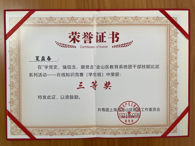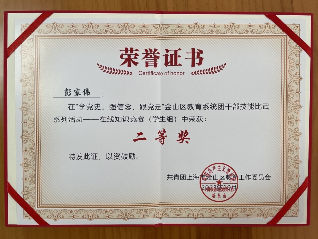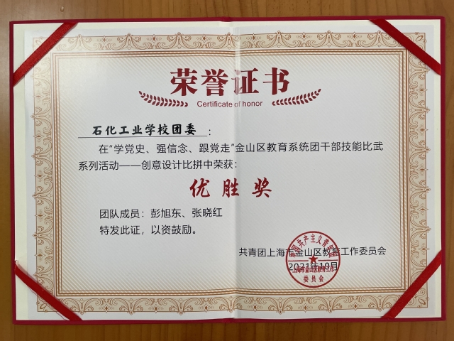 石化工业学校团委获得“学党史、强信念、跟党走”金山区教育系统团干部技能比武系列活动——创意设计比拼优胜奖。彭佳伟、顾润青同学获得“学党史、强信念、跟党走”金山区教育系统团干部技能比武系列活动——在线知识竞赛(学生组)二等奖。夏盈春同学获得“学党史、强信念、跟党走”金山区教育系统团干部技能比武系列活动——在线知识竞赛(学生组)三等奖。