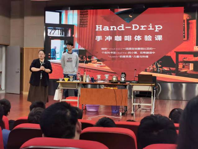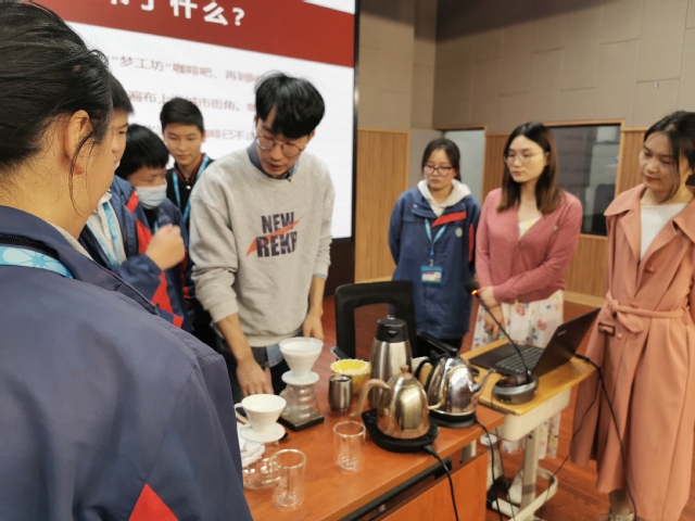 首先,咖啡师张在东老师为大家讲解咖啡的基础知识,包括咖啡的起源、产地、品种和成分。其次,讲解了咖啡在上海的发展,特地提到了上海几家公益性咖啡店的开创,是“以学生为本”的“终身教育”和“发展教育”的现实版本。随后,咖啡师现场给大家演示了手冲咖啡的冲泡方式,并且邀请学生上台尝试“手冲咖啡的制作”。同学们都跃跃欲试,在专业咖啡师张老师的指导下,几位同学完成了“手冲咖啡”的冲泡,完成任务的喜悦之情溢于言表,小干同学表示迫不及待地想让爸爸也品尝一下他亲手做的咖啡。在讲座过程中,同学们和咖啡师张老师进行了良好的互动;在咖啡冲泡过程中,同学们严肃认真,求知欲饱满,善于思考和提问,勇于尝试,乐于分享,一次次将共同学习的氛围推向高潮,实现了师生之间的沉浸式互动。