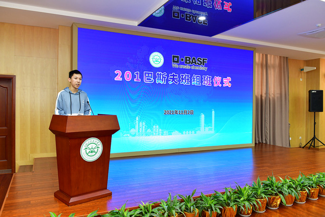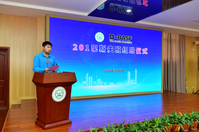 新一届巴斯夫班共25名同学,201巴斯夫班何家兴作为学生代表发言,表示进入巴斯夫班是一份深深的责任,同学们将志存高远,努力学习,积极回报社会。