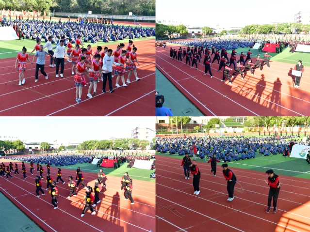 运动会开幕式在慷慨激昂的运动员进行曲中拉开序幕,踏着青春的步伐,伴着激昂的旋律,护旗方阵、红旗队、鲜花队和各专业科运动员代表队依次入场。同学们排着整齐的队伍,迈着强劲有力的步伐,喊着响彻云霄的口号,朝气蓬勃、意气风发地依次从主席台前经过。铿锵的鼓点,撞击着年轻的心扉,激昂的旋律,充满了向上的力量。花样跳绳、武术表演、啦啦操以及云南班学生的集体舞蹈在学生和老师热烈的掌声中将整个开幕式推向高潮。