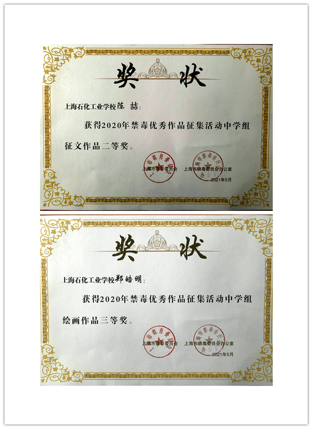 近日,上海市禁毒办、上海市教委公布了《关于对禁毒优秀征集作品进行表彰的通报》,表彰在参与禁毒活动中表现突出的中小学生,金山区共有六位学生获奖,我校陈喆同学获得征文二等奖,郑皓明同学获得绘画三等奖。