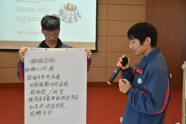 20日上午的培训以“能力修炼”主题环绕开始。邓卓霞通过“元旦晚会排练,班主任不同意,该怎么解决?”作为问题,让学生们思考,最后通过邓卓霞老师的讲解,帮助了学生在遇见困难时,如何拆解困局,解决问题。接着通过几段小视频,让学生们懂得了在与对方争论时,自己到底要的是对错还是效果,以及在遇到任务时,学生们该如何完成。