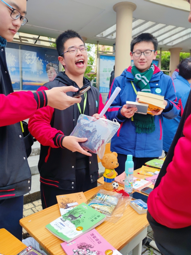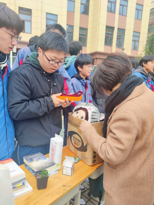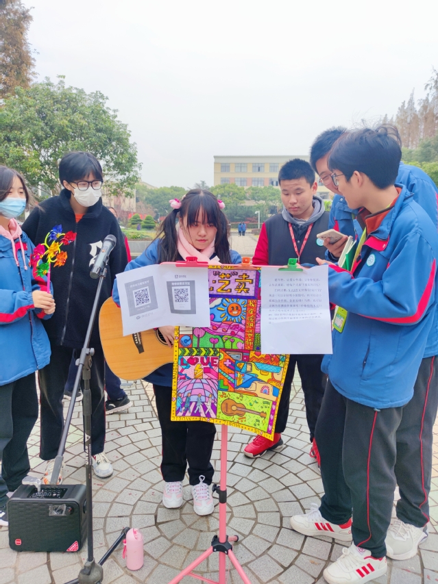 在驻校社工的倡议下,学生们将家中闲置的书籍、文具、玩具、学习用具或自己制作的手工艺品、书画篆刻作品、各种小饰品小纪念品小礼物带来参加义卖。学生保障工作党支部的老师们也奉献了一整箱的爱心物资。海鸥广场热闹非凡,俨然成了一个热闹的集市,学生们都激情澎湃,“走一走,瞧一瞧,好货不容错过”“甩卖啊,大甩卖......”叫卖声此起彼伏。为了让同学在自家摊位多逗留,将自家的东西出售,同学们叫卖也更加卖力“骨折价骨折价”“买一赠一”,还有的干脆拿着义卖品向闲逛的老师和同学极力推销。海鸥广场“集市”中央还有引人注目的爱心“艺”卖,同学以吉他弹唱点歌的形式参与到义卖活动中,吸引了很多老师和同学。