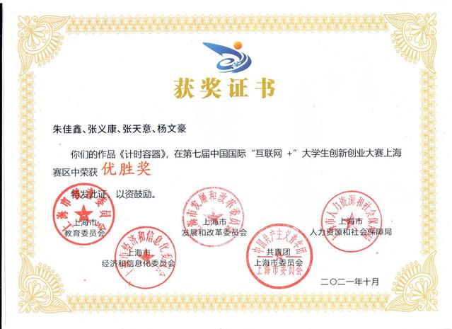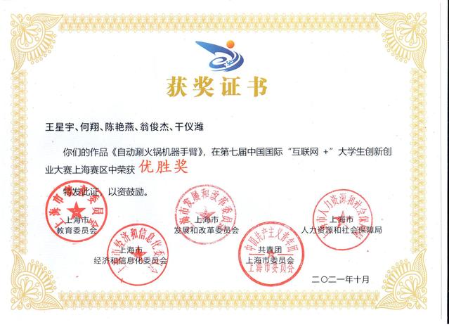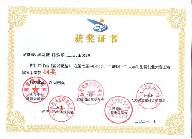为全面落实习近平总书记给中国“互联网+”大学生创新创业大赛“青年红色筑梦之旅”大学生回信重要精神,深入推进大众创业万众创新,加快培养创新创业人才,上海举办了以“我敢闯、我会创”为主题的第七届中国国际“互联网+”大学生创新创业大赛。在收到参赛通知后,我校许多同学思绪迸发,参与热情高涨,在朱昕玮老师的耐心指导下,吴京豪、杨威薇、陈鸿颐、王珏、王文超小组的作品《智能花盆》荣获铜奖;王星宇、何翔、陈艳燕、翁俊杰、干仪潍小组的作品《自动涮火锅机器手臂》,朱佳鑫、张义康、张天意、杨文豪小组的作品《计时容器》,华顺豪、郑皓明、贾琪瑞、汤储杰小组的作品《智能高空抛物预警系统》荣获优胜奖。