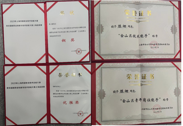 我校深化青年教师队伍建设,积极鼓励青年教师参加专业培训及技能竞赛等活动,助推教师成长。围绕金山区打响“上海湾区”城市品牌,随着智能制造技术的革新,两位老师参与工业机器人、智能制造等培训,时代在进步,技术在革新,老师们也在与时俱进。机电科亦注重青年教师的教学能力、职业技能等方面提升,机电科备赛团队教师一起努力,群策群力。她们不断磨砺专业技能,保持匠心,最终斩获市级一类竞赛一铜一优胜的好成绩,正是我校在选手培养方面成绩突出,被授予“2021年金山区职业技能大赛优秀组织单位”。
